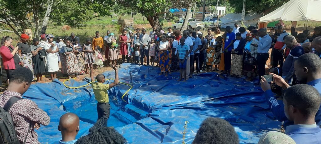 Durante a última semana, estávamos esperançosos de que haveria batismos, por isso fizemos um tanque batismal improvisado. Um buraco foi cavado no solo com cerca de 2,5 metros de comprimento, 1,3 metros de largura e 1 metro de profundidade. Depois, usando tábuas de madeira, formaram escadas que levavam ao buraco. Por fim, colocamos no chão uma grande lona impermeável, trabalhando-a na cavidade, criando o nosso tanque batismal.